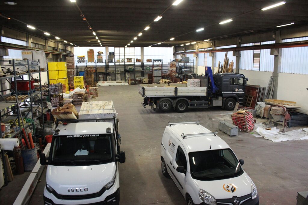 Tra le attrezzature principali figurano un camion a tre assi con gru, escavatori, furgoni e strumentazioni specifiche per lavorazioni su cemento, ferro, legno e finiture.